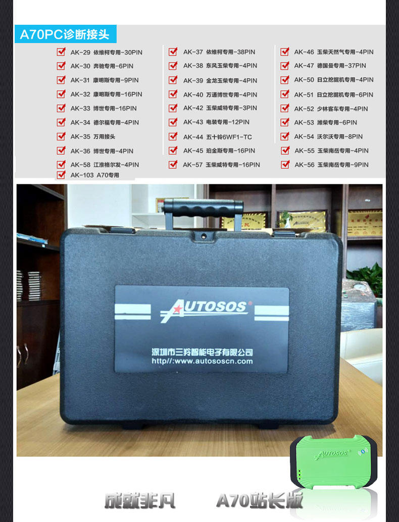 柴油測神A70站長版解碼器是深圳三羚公司根據(jù)市場需求為社會維修廠提供的一款基于技術(shù)服務(wù)支持的綜合性汽車電腦診斷儀,也是一款綜合性工程機(jī)械診斷儀,支持手機(jī)版診斷儀,擁有國六DPF高溫再生和SCR后處理試驗臺功能,旨在解決商用車后市場技術(shù)需要提升的維修廠,深圳三羚公司汽車電腦診斷儀十五年堅持自主研發(fā),先后榮獲慧聰網(wǎng)商用車十佳售后服務(wù)企業(yè),內(nèi)燃機(jī)行業(yè)協(xié)會授予的商用車售后服務(wù)貢獻(xiàn)獎,從第一臺手持式A30C柴油車解碼器到測神30PC柴油車解碼器再到測神A60PC柴油車解碼器,到測神A70PC站長版柴油解碼器,一直以檢測精準(zhǔn),測試全面,技術(shù)精湛,服務(wù)至上的經(jīng)營理念深受廣大維修人員推崇,迄今為止有三千多家柴油測神A70站長版解碼器用戶加盟三羚服務(wù)站,成為當(dāng)?shù)貐^(qū)域汽修龍頭中堅力量,因其過硬的技術(shù)讓主機(jī)廠家主動為其設(shè)立服務(wù)站,為國家汽車后市場努力奉獻(xiàn)。